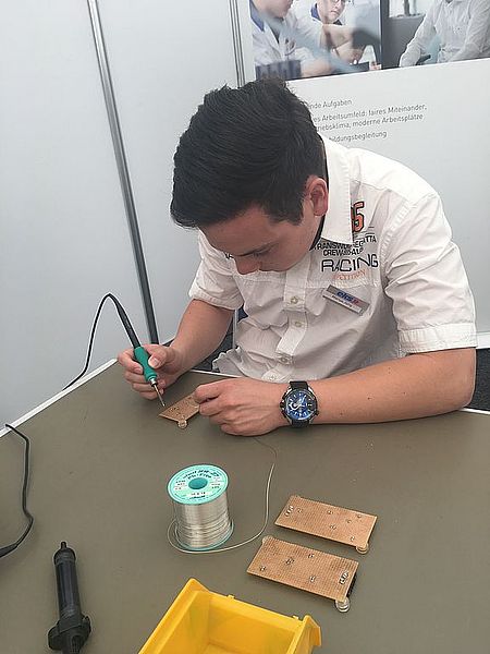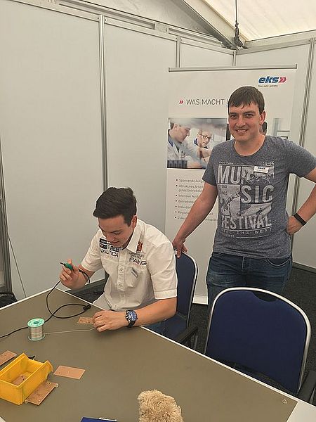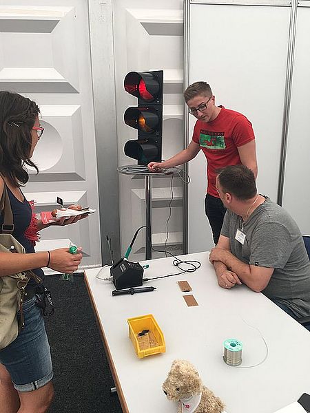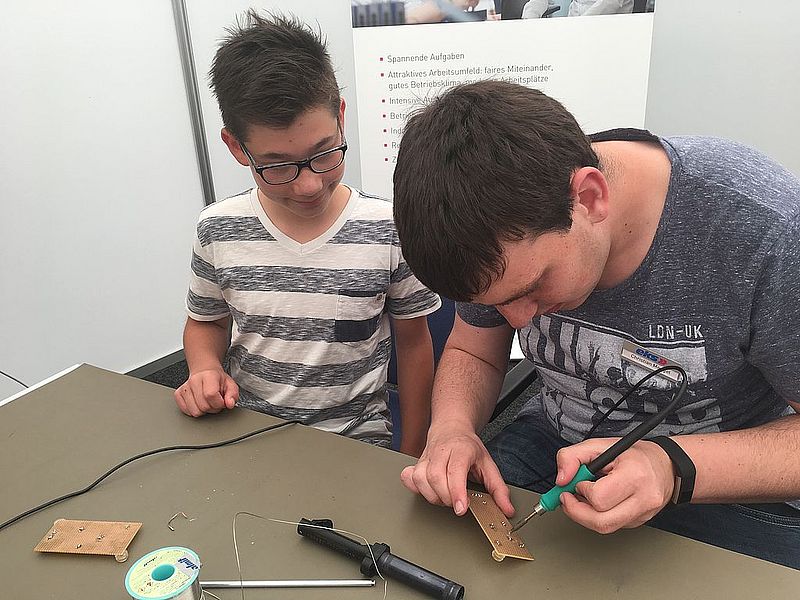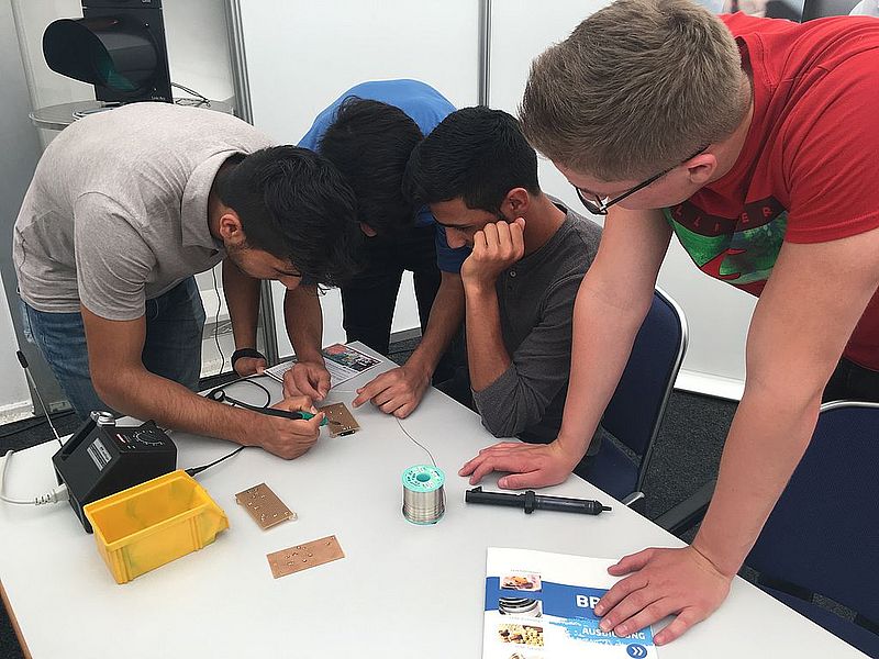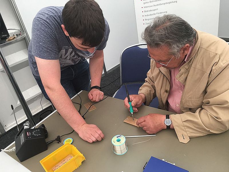 Beim Löten konnten die Schüler und Schülerinnen ihr handwerkliches Geschick unter Beweis stellen. Aber nicht nur die Jugendlichen waren interessiert an Technik; auch deren Eltern hatten Spaß daran und haben sich am Lötkolben und den Leiterplatten versucht.