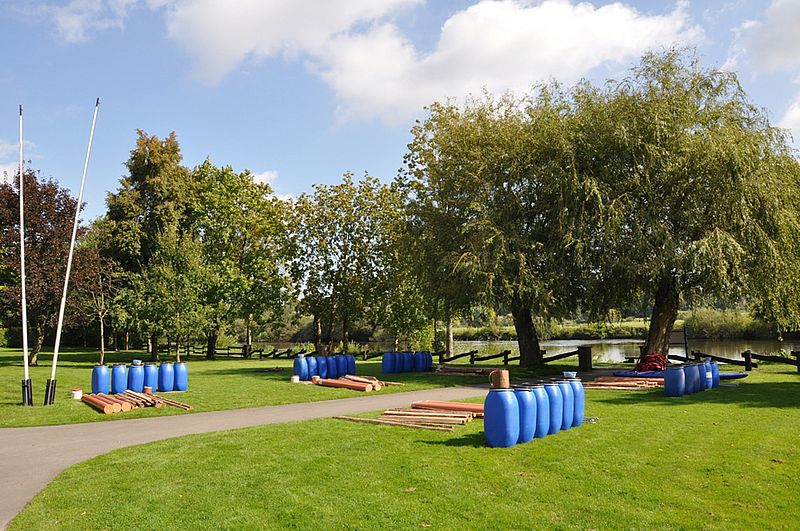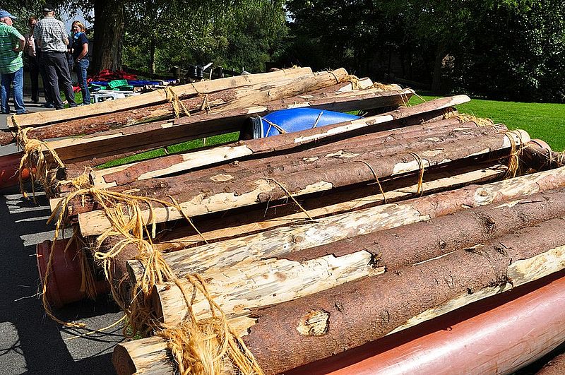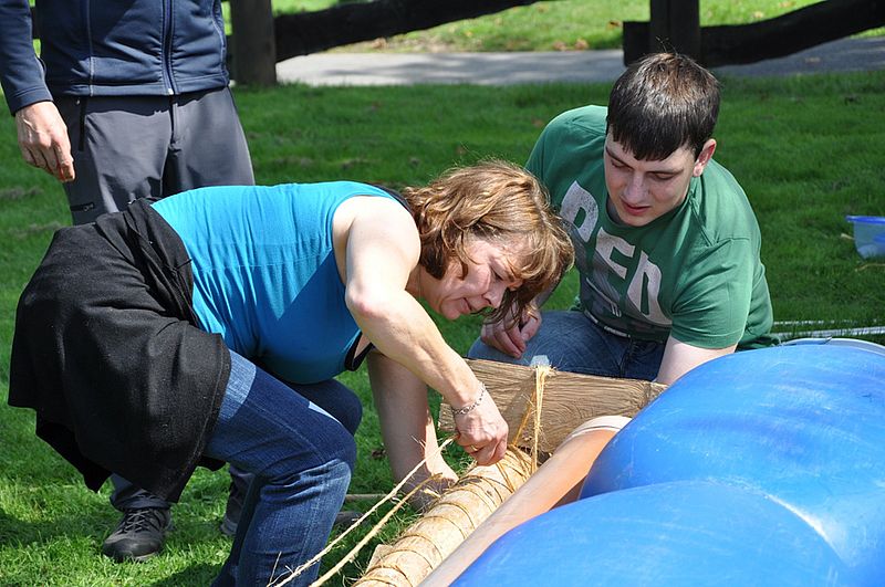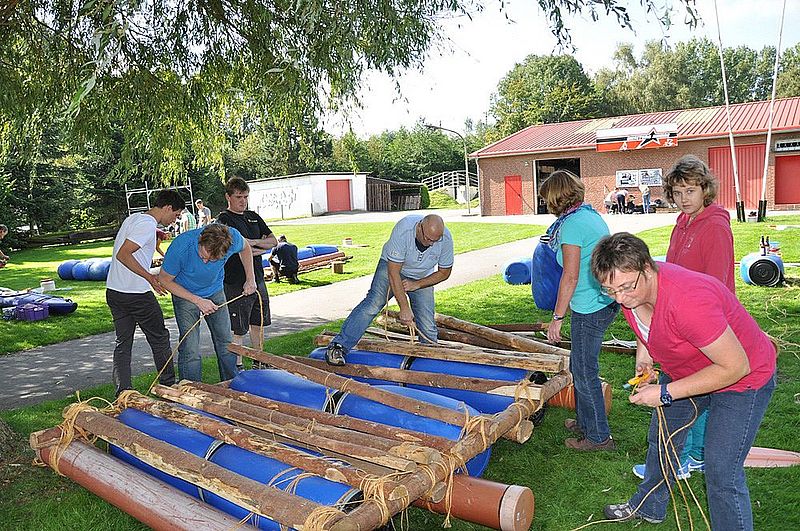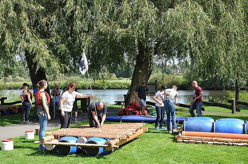 So weit so gut...nach einer gut zwei stündigen Fahrt und einem zügigen, aber leckeren Frühstück, bei dem das Brötchen-Schmier-Team alles gab, wurden wir auf den letzten Metern endlich erlöst. Jeder von uns hatte bereits eine Nummer gezogen, damit verschiedene Gruppen gebildet werden konnten und es ging ein Raunen durch den Bus: "Was hat er gesagt? Flöße? Aus verschiedenen Materialien? Ich fahr doch nicht mit einem selbst gebauten Floß!" Wir hatten richtig verstanden. In fünfer bzw. sechser Teams sollten wir (unter Anleitung, aber psst!) Flöße bauen, mit denen wir dann in "See stechen" und ein paar Meilen zurücklegen konnten.