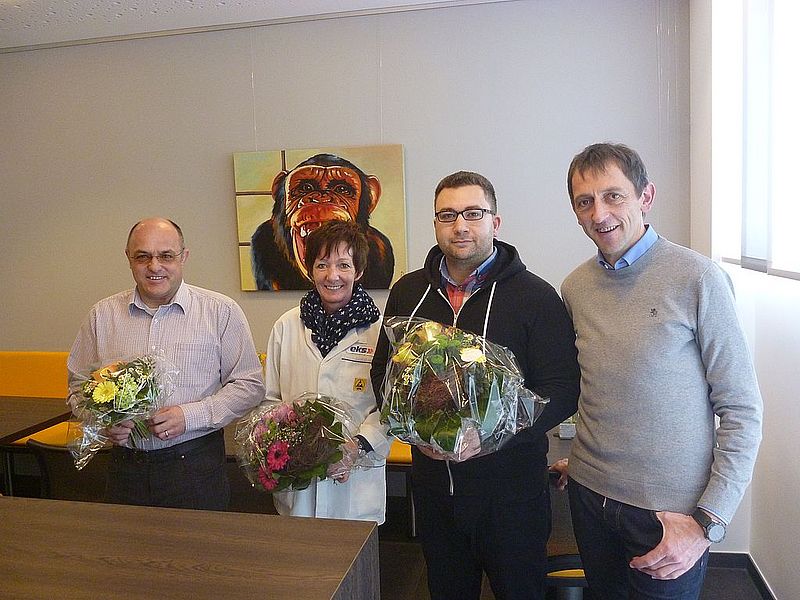 Ralph Engel überreichte den Jubilaren als Dank einen Blumenstrauß und zum Abschluss gab's natürlich ein paar Fotos für's eks Album mit Jubilaren, Chef und Abteilungsleitern.