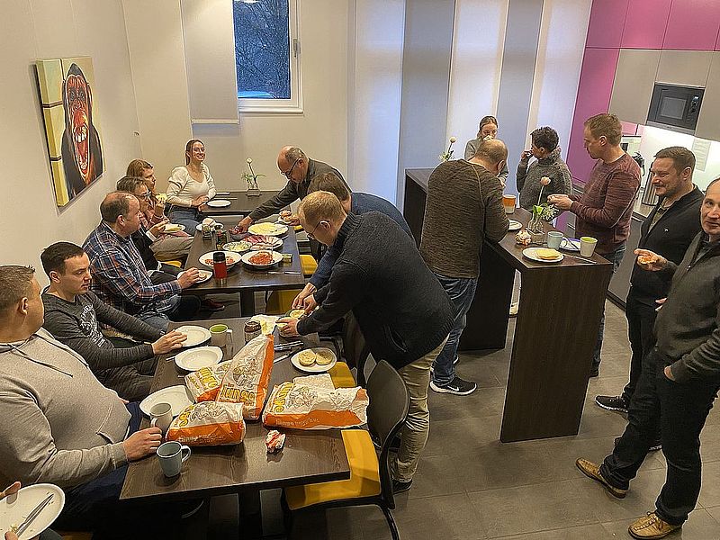 Ja. In der Frühstücks- und auch in der Mittagspause ist es selbstverständlich, dass alle Mitarbeiter in meiner Abteilung in der Küche zusammenkommen und die Zeit der Pause nicht nur mit Essen, sondern auch mit gemeinsamen Unterhaltungen verbringen. Einige meiner KollegInnen gehen auch mittags bspw. gemeinsam hier im Dorf spazieren.