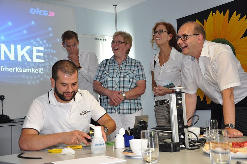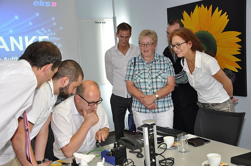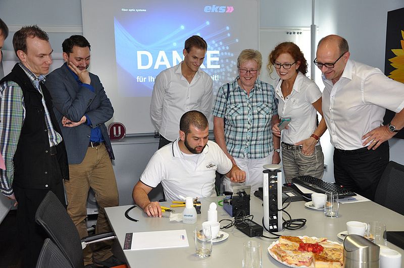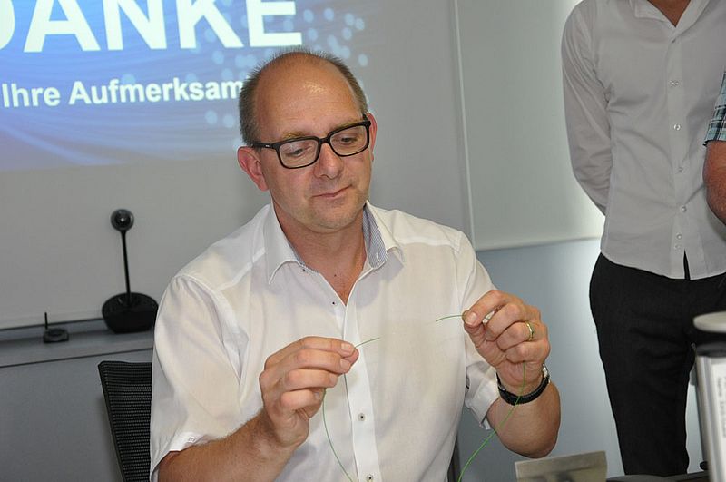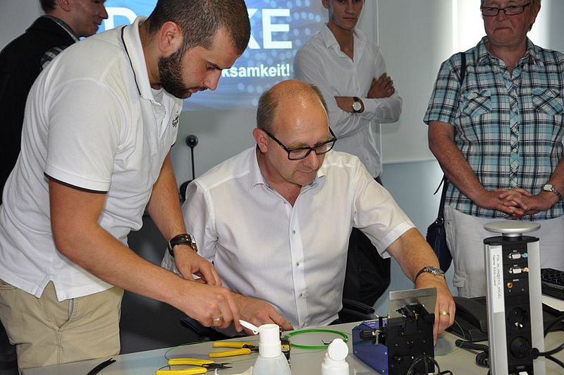 Im Anschluss an die Diskussion und den Vortrag durfte der Generalsekretär noch selbst ran und spleißte unter den Augen seiner gespannten Parteigenossen und -genossinnen eine Glasfaser, was auch auf Anhieb klappte.
