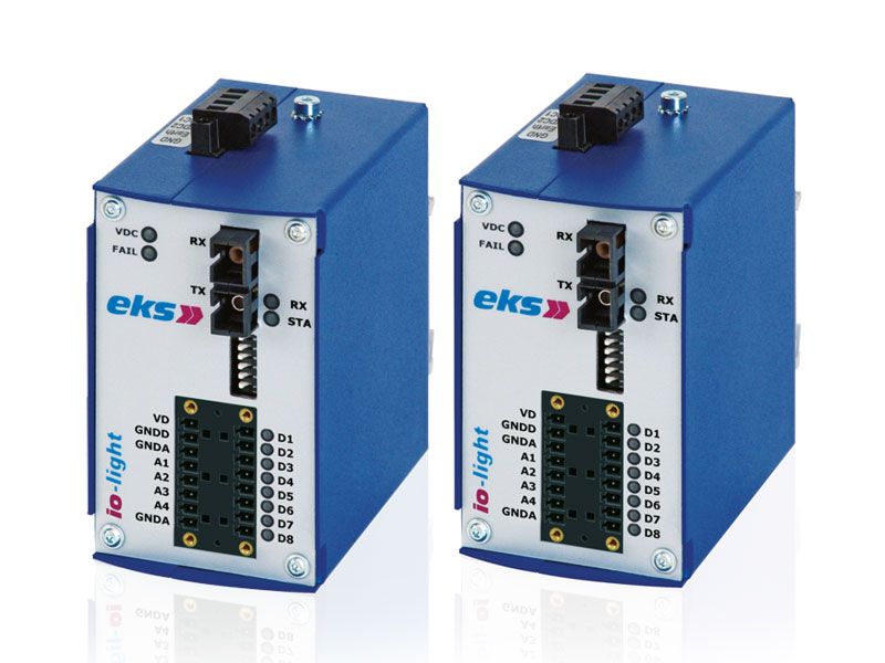 The fiber optic system is able to transmit up to 8 digital signals (12–24 VDC) and/or 4 analog signals (0–10 V or 0–20 mA, digitalized via A/D converter with a resolution of 10 Bit) within a point-to-point structure or line-structure.