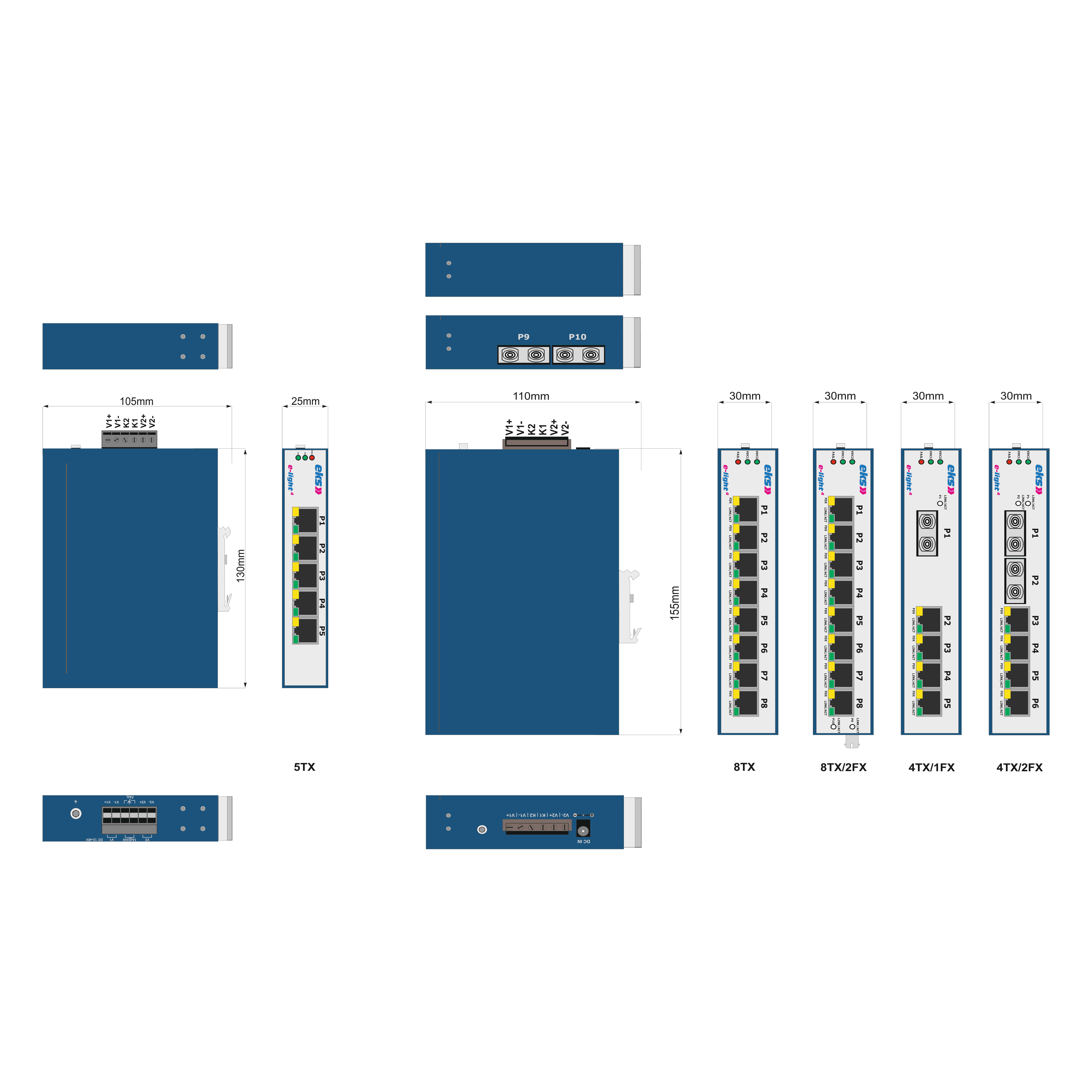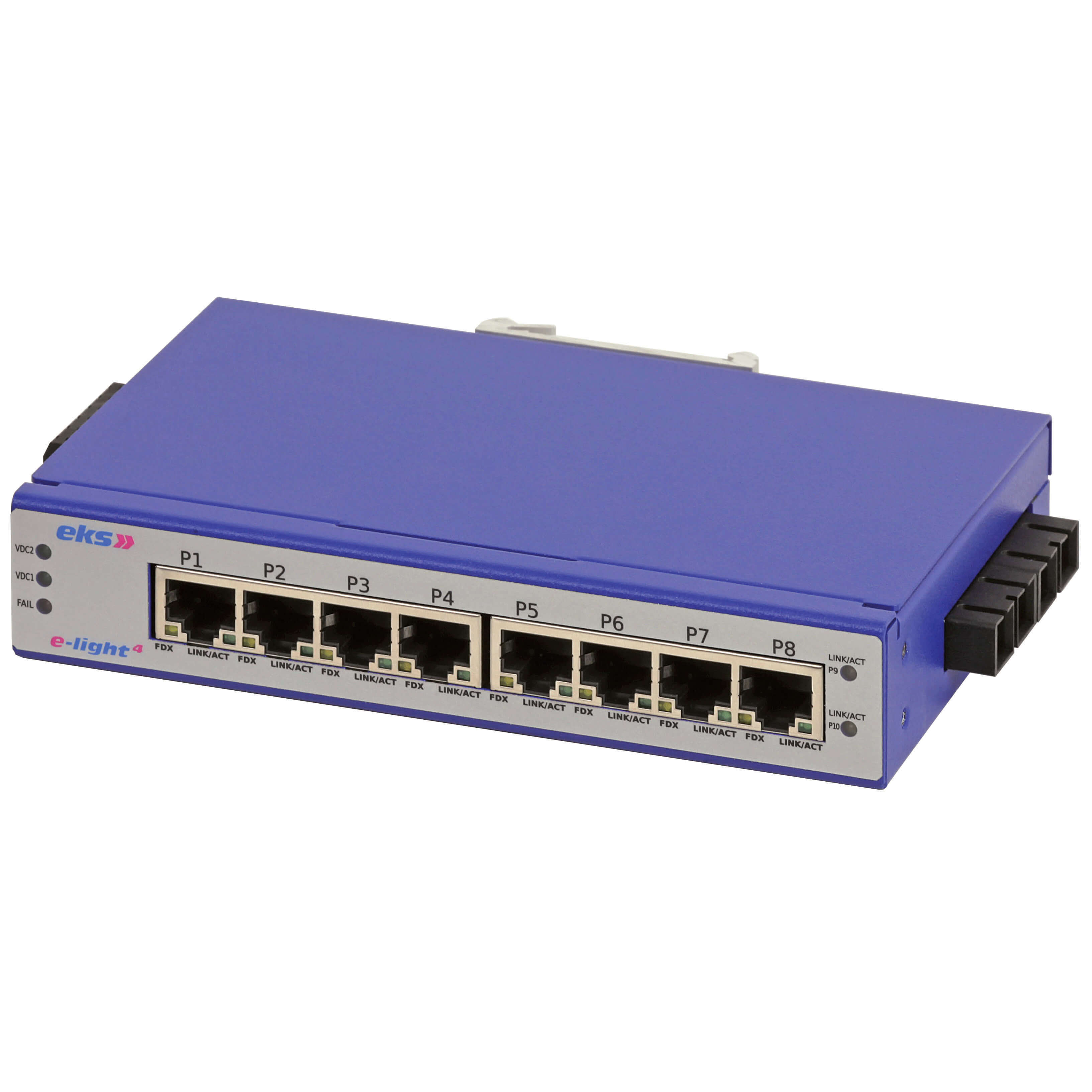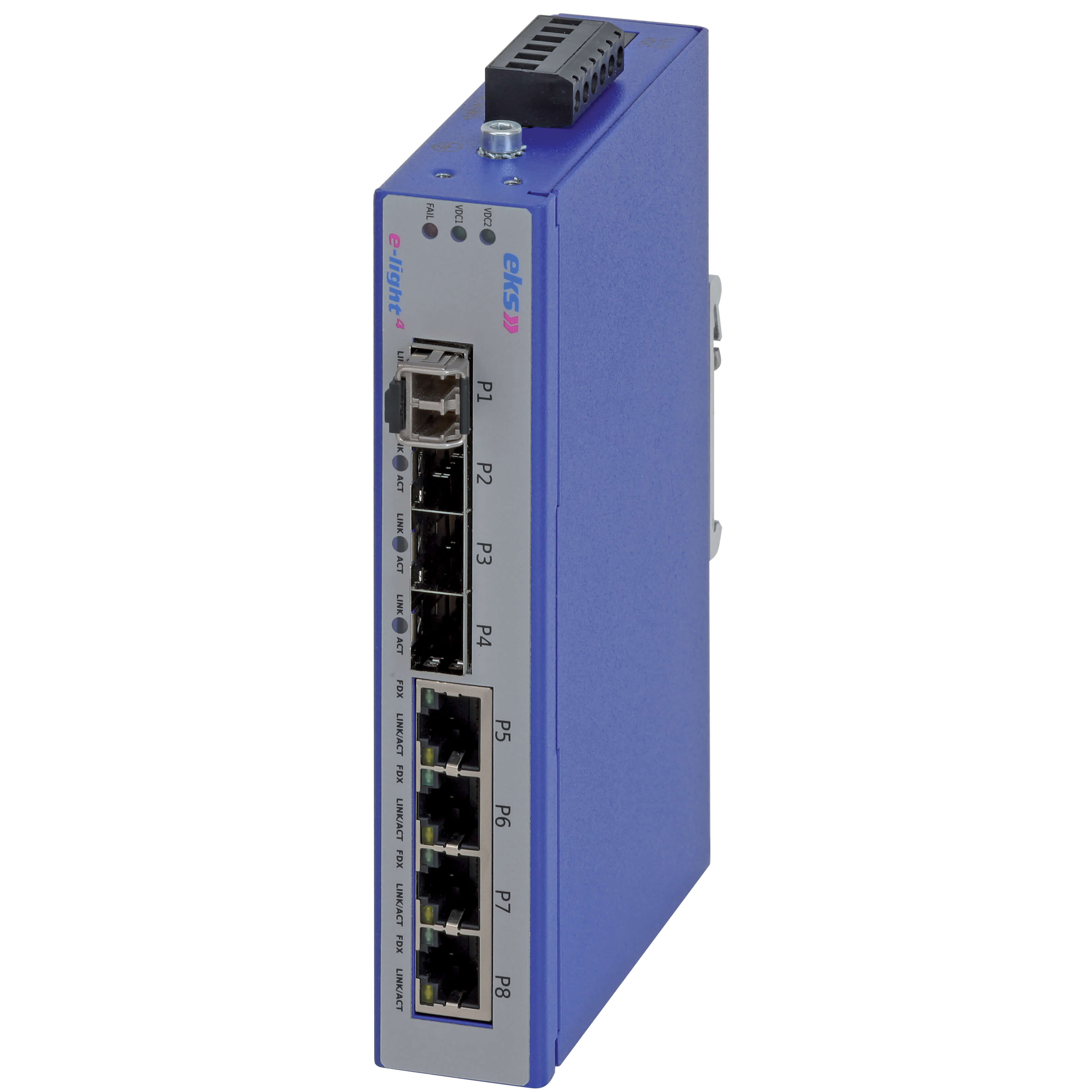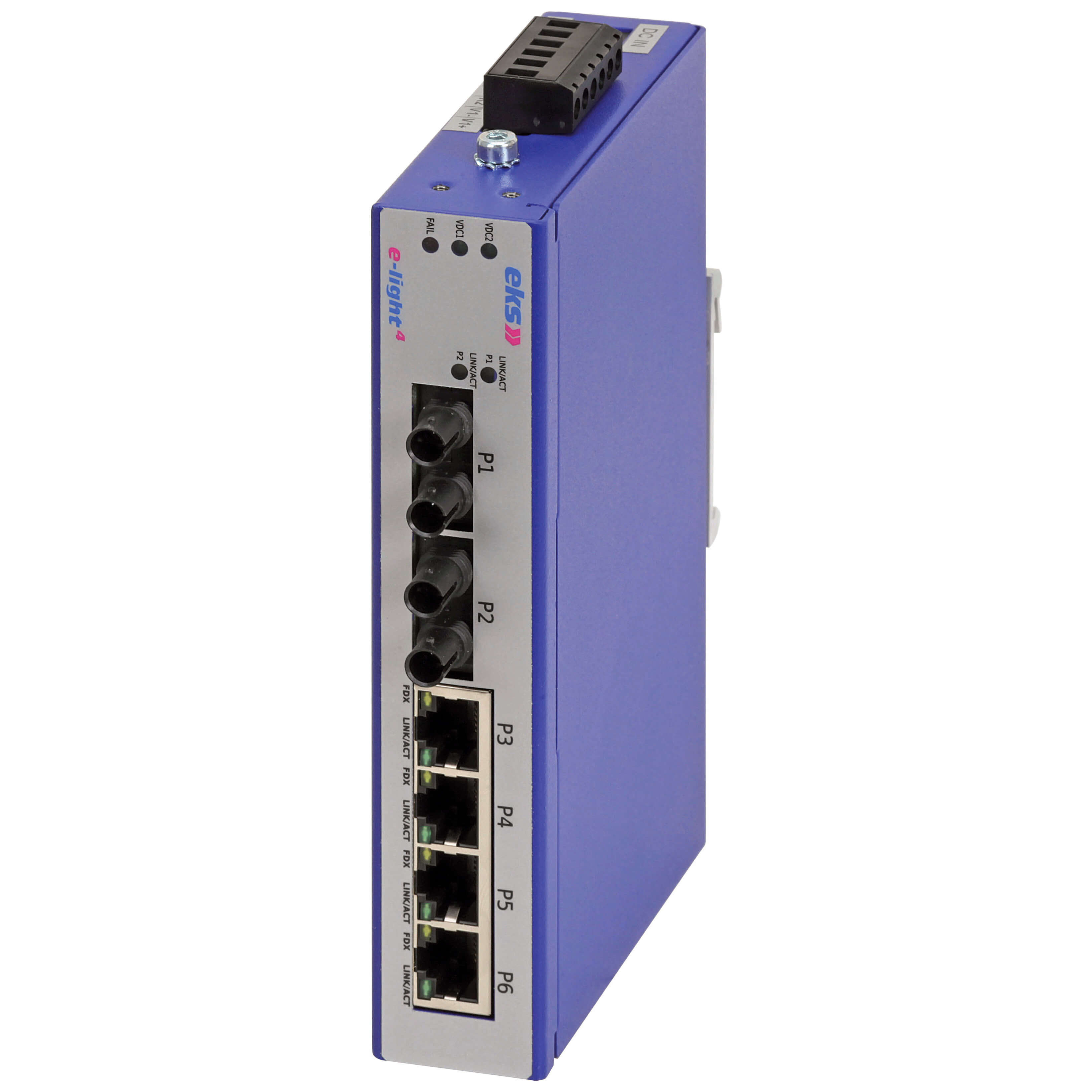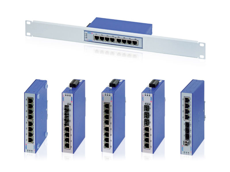 The following switches are available: 8 TX, 8TX/2FX, 4TX/2FX, 4TX/1FX and 4TX/3FX. They can be used with singlemode, multimode, HCS and POF fibers. All switches are suitable for distances of up to 30 km. Other features are auto negotiation, MDX/MDIX and an extended temperature range. The redundant power supply is 12 to 70 VDC and its status – as well as the network status – can be seen from the LEDs on the front panel.