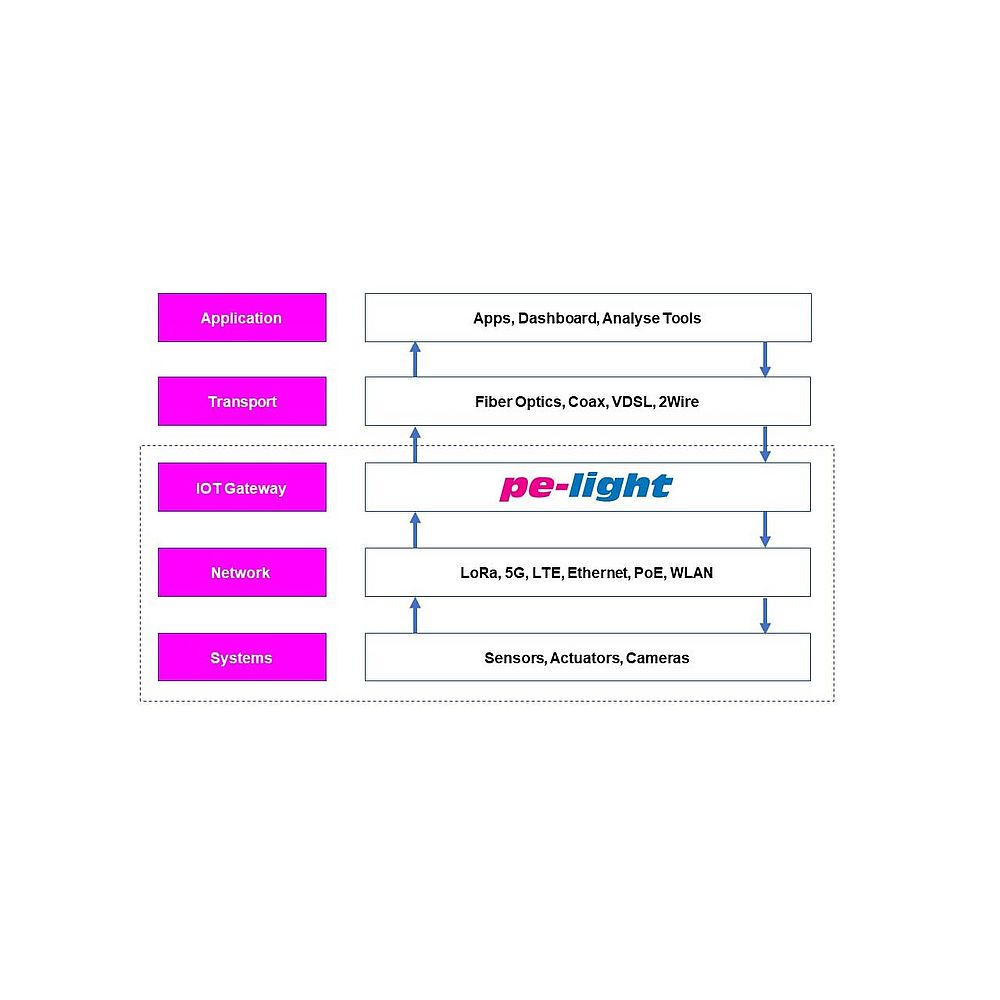 In order to build up the required comprehensive, close-meshed network to implement the Smart City concept, municipalities must create new networked infrastructure elements or digitise existing ones. Lighting poles, for example, of which there are more than 9 million in Germany, lend themselves to this. With this approach, municipalities can kill two birds with one stone. Many of these poles will have to be converted to energy-saving LED technology in the coming years. And they already have a power connection that can also be used to supply power to the network technology, PE Light S functions as an IOT gateway between the network level on the mast and the transmission path to the application.
